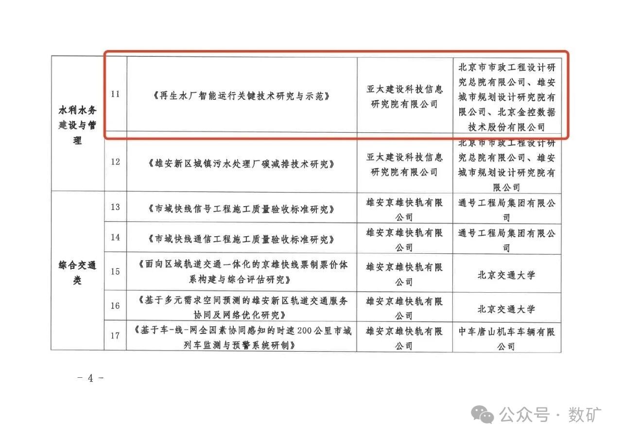 近日,河北雄安新区建设和交通管理局正式下达《2025年雄安新区建设科技计划项目的通知》。金控数据作为核心合作单位,荣幸参与其中“水利水务建设与管理”领域的重点项目——《再生水厂智能运行关键技术研究与示范》。